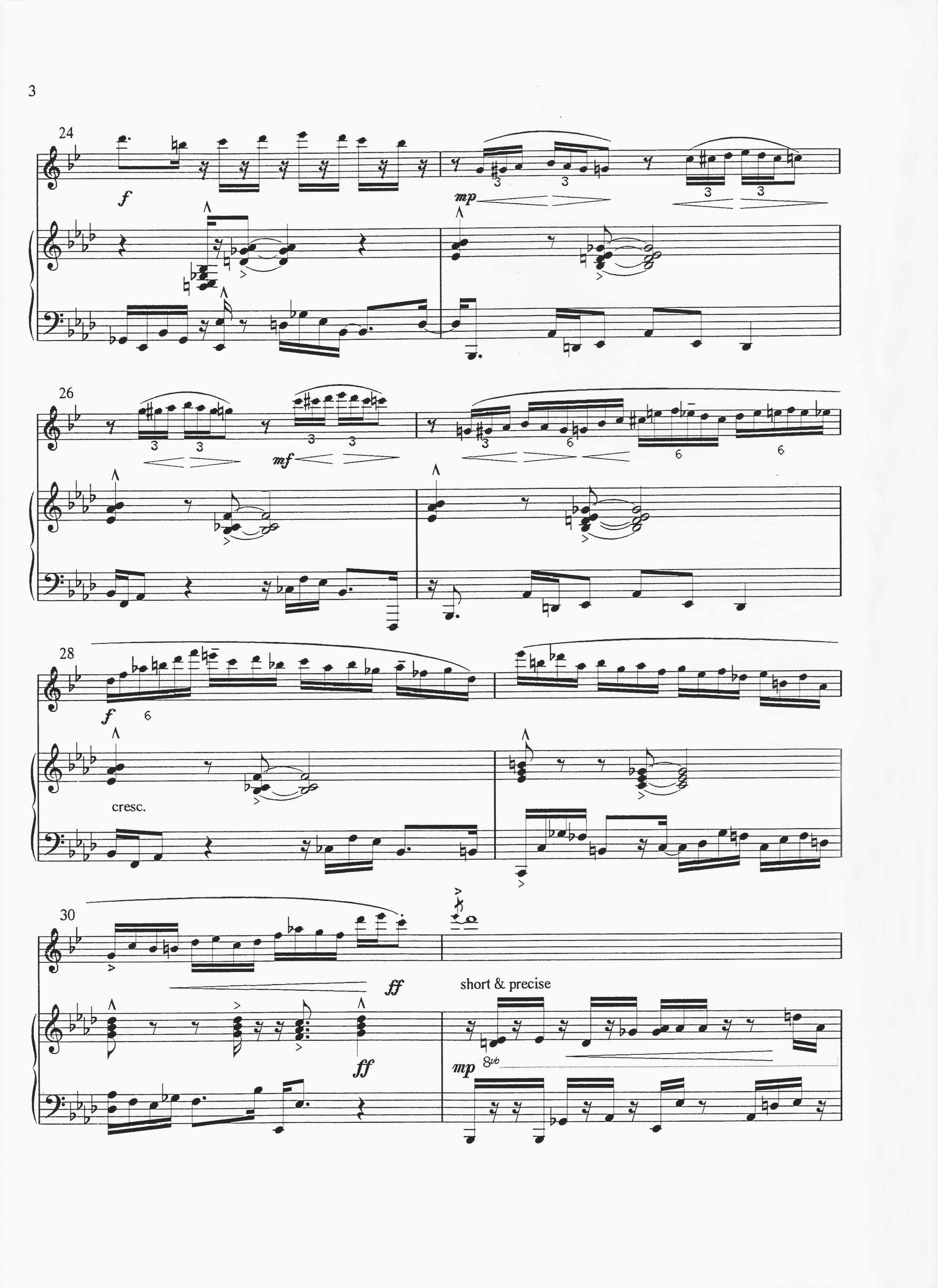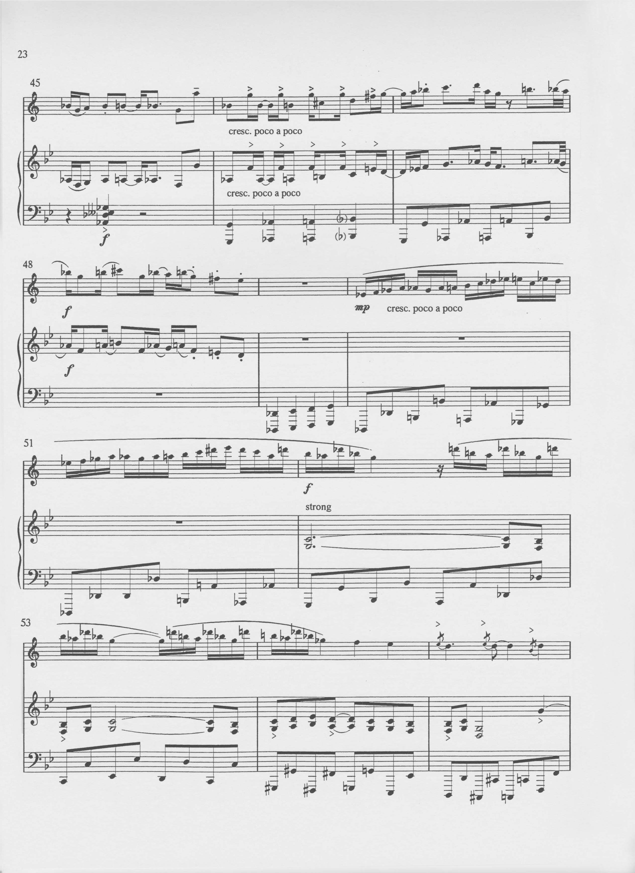 The first movement, Don’t let up funk, has a powerful pointillist texture which frames a cool, lunging swing section. Both sax and piano get a chance to let loose with improvisations (cuts optional) before a powerful declamatory section returns us to the funk. The vibrant ending, with sax on impressively high harmonics, makes this a useful single movement work for shorter concert programmes.
